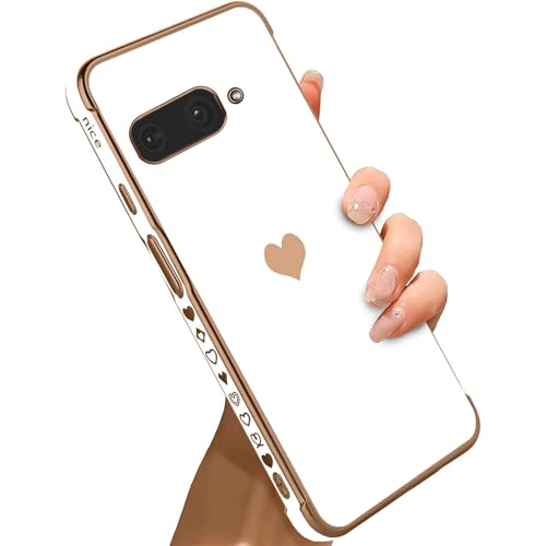 Knoowcase for Google Pixel 9A Case for Girls Women Shockproof Flexible Silicone Bumper Lens Protection Luxury Plated Gold Heart Slim Anti Scratch Phone Cover for Google Pixel 9A,White