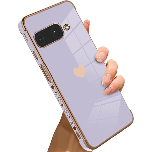 Knoowcase for Google Pixel 9A Case for Girls Women Shockproof Flexible Silicone Bumper Lens Protection Luxury Plated Gold Heart Slim Anti Scratch Phone Cover for Google Pixel 9A,Purple