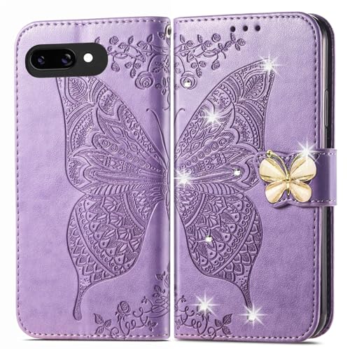Reevermap for Google 9A Case Glitter Crystal Flip PU Leather Phone Cover for Google Pixel 9A, Shockproof Wallet Card Slots Butterfly Gems Bling Shiny Magnetic Clasp Kickstand, Light Purple