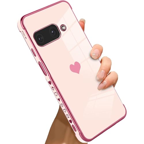 Knoowcase for Google Pixel 9A Case for Girls Women Shockproof Flexible Silicone Bumper Lens Protection Luxury Plated Gold Heart Slim Anti Scratch Phone Cover for Google Pixel 9A,Pink