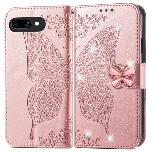 Reevermap for Google 9A Case Glitter Crystal Flip PU Leather Phone Cover for Google Pixel 9A, Shockproof Wallet Card Slots Butterfly Gems Bling Shiny Magnetic Clasp Kickstand, Rose Gold