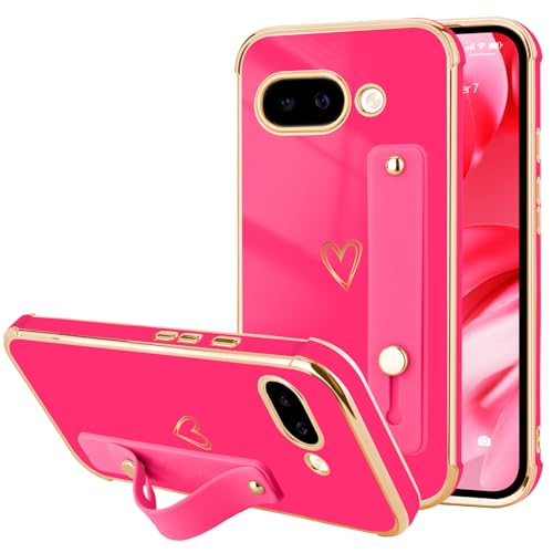 LLZ.COQUE for Google Pixel 9a Case for Women Girls, Luxury Plated Bumper with Cute Heart Design Cover, Adjustable Hand Strap Stand Protection Phone Case for Google Pixel 9a, Hot Pink