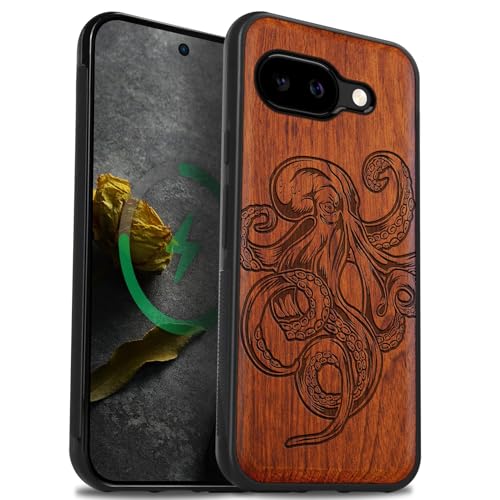 Carveit Magnetic Wooden Case for Google Pixel 9a Case, Wood Artisan Engraved & Soft TPU Shockproof Cover, Compatible with MagSafe Wireless Chargers (Octopus Drawing) Rosy