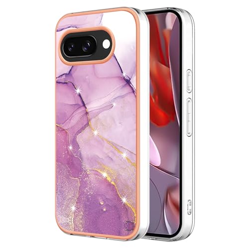 Knoowcase for Google Pixel 9A Case Marble Silicone Cover Shockproof Bumper Glitter Plated Gold Edges Protective Flexible TPU Rubber Skin Case for Google 9A Women,Dark Purple