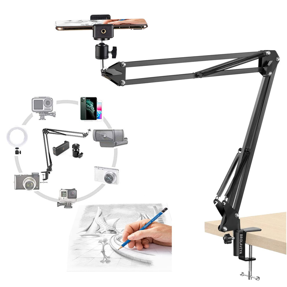 Overhead Video Mobile Stand with Metal Long Arm, 1/4" Ball Head, Compatible with Cameras, GoPro, Webcams, Black