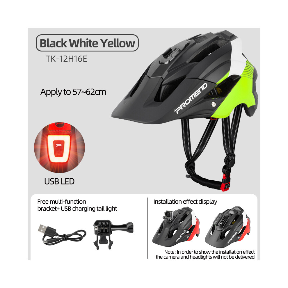 (CHINA, White) PROMEND MTB Bike Downhill Helmet LED Lights gopro Camera Holder Road Cycling Helmet Outdoor Sport Riding Bicycle Helmet