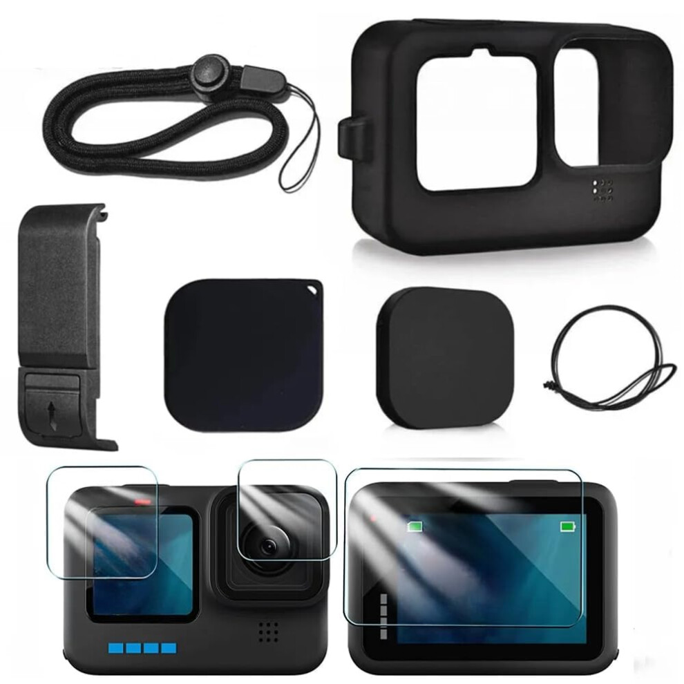 Kuptone Accessory Kit for GoPro 12/11/10/9 Black [10PCS], Protective Silicone Case with Cord+6PCS Screen Protectors + 3PCS Lens Cap Cover for GoPro Hero 12/11/10/9