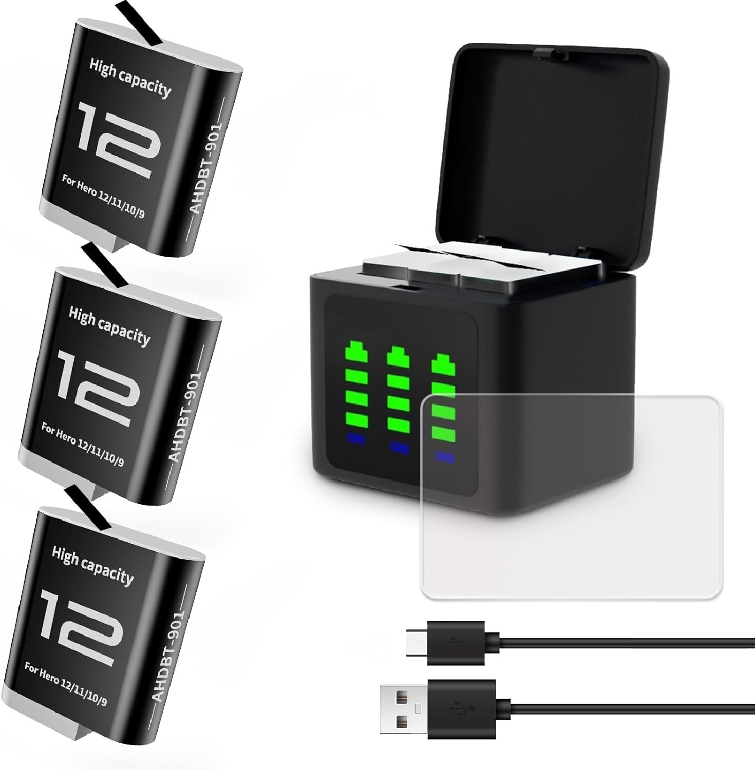 Battery Charger + 3 batteries for GoPro Hero 12 11 10 9 Black, 2580mAh