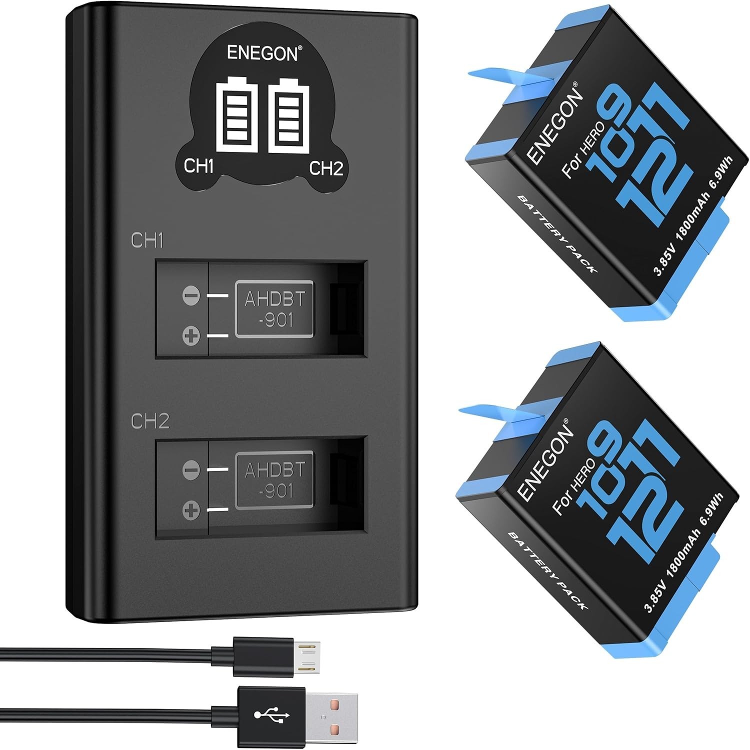 ENEGON 2 Pack 1800mAh Battery for GoPro Hero 12 11 10 9 Rechargeable Li-Ion
