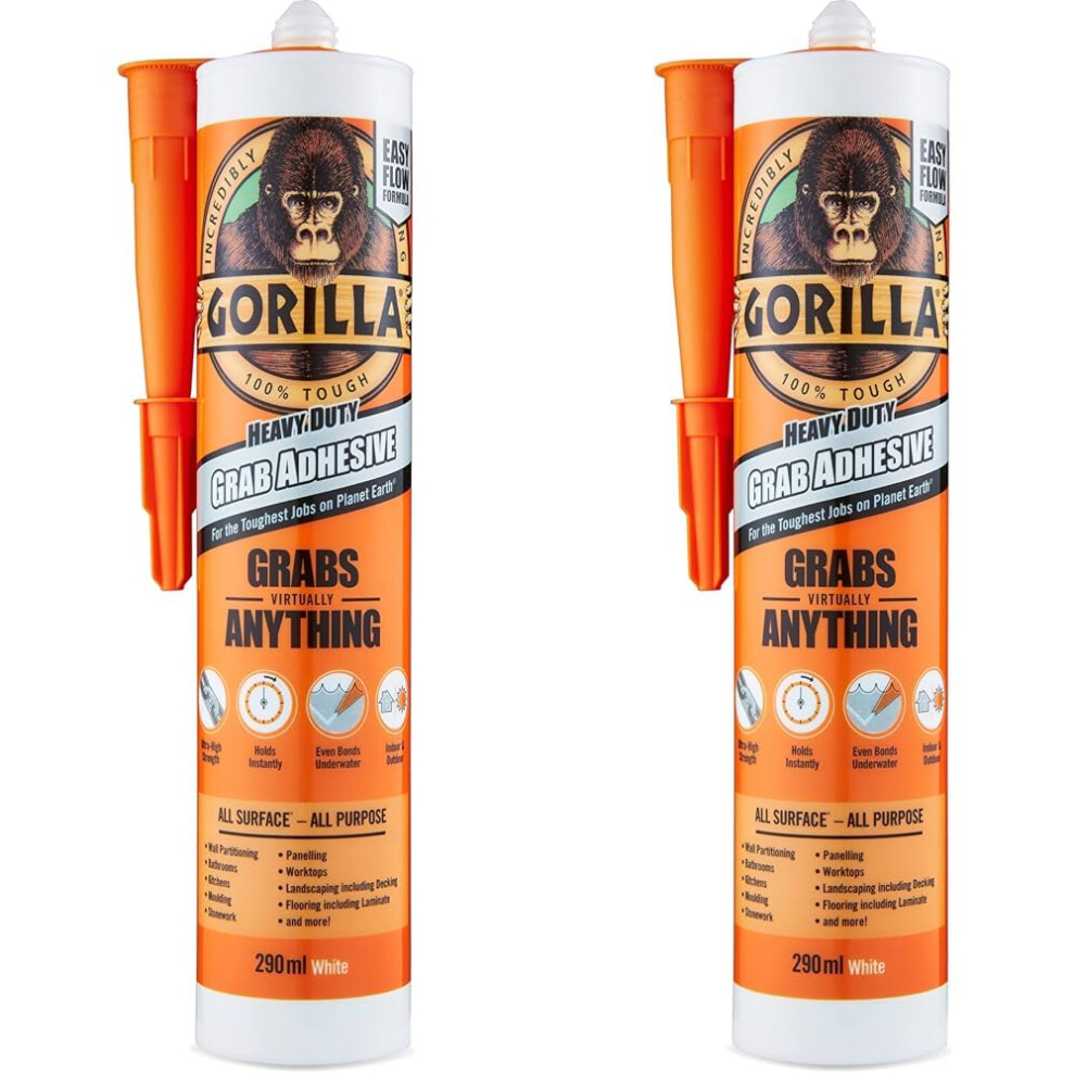 Gorilla Heavy Duty White Grab Adhesive, 200ml Tube (2 Pack) â All-Purpose, Ultra-High Strength & Instantly | 100% Waterproof & Temperature Resistant