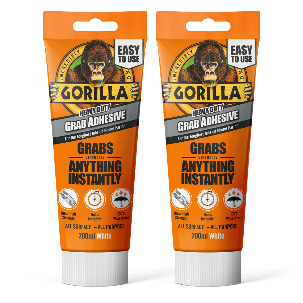 Gorilla Heavy Duty White Grab Adhesive, 200ml Tube (2 Pack) ? All-Purpose, Ultra-High Strength & Holds Instantly | 100% Waterproof & Temperature