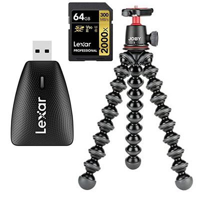 JOBY GorillaPod Kit, Lexar 64GB Card and Reader