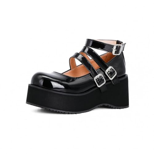 smlekwc Women's Patent Leather Platform Mary Janes Triple Straps with Buckles Closed Round Toe Gothic Shoes,Black,3 UK