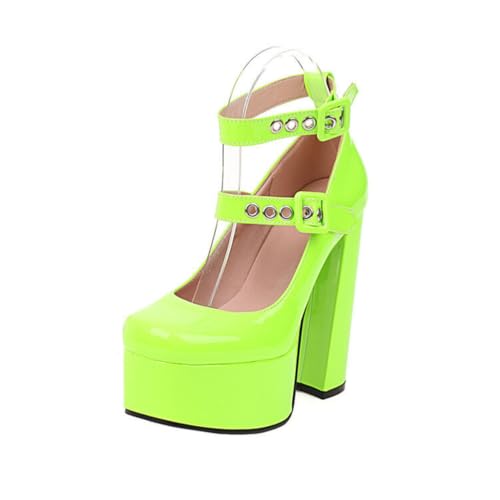 SMAALEB Platform Mary Janes for Women Patent Leather Dress Pumps with Double Buckle Block High Heel Gothic Shoes,Green,3 UK