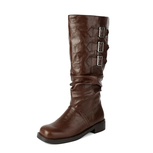 Women's Knee High Riding Boots Belt Buckle Decor Low Heel Square Toe Pull On Biker Motorcycle Gothic Shoes (Brown,3)