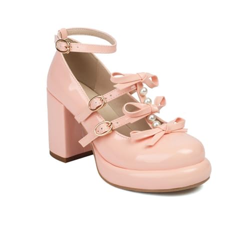 HXTYXCQ Women's Patent Leather Platform Pumps with Buckle Round Toe Mary Janes with Bow Chunky High Heel Gothic Shoes,Pink,3 UK