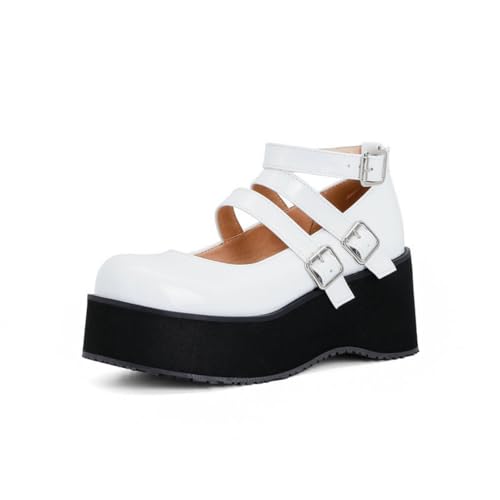 smlekwc Women's Patent Leather Platform Mary Janes Triple Straps with Buckles Closed Round Toe Gothic Shoes,White,3 UK