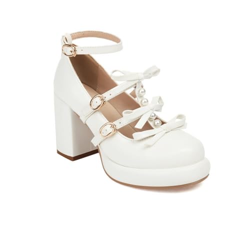 HXTYXCQ Women's Patent Leather Platform Pumps with Buckle Round Toe Mary Janes with Bow Chunky High Heel Gothic Shoes,White,3 UK