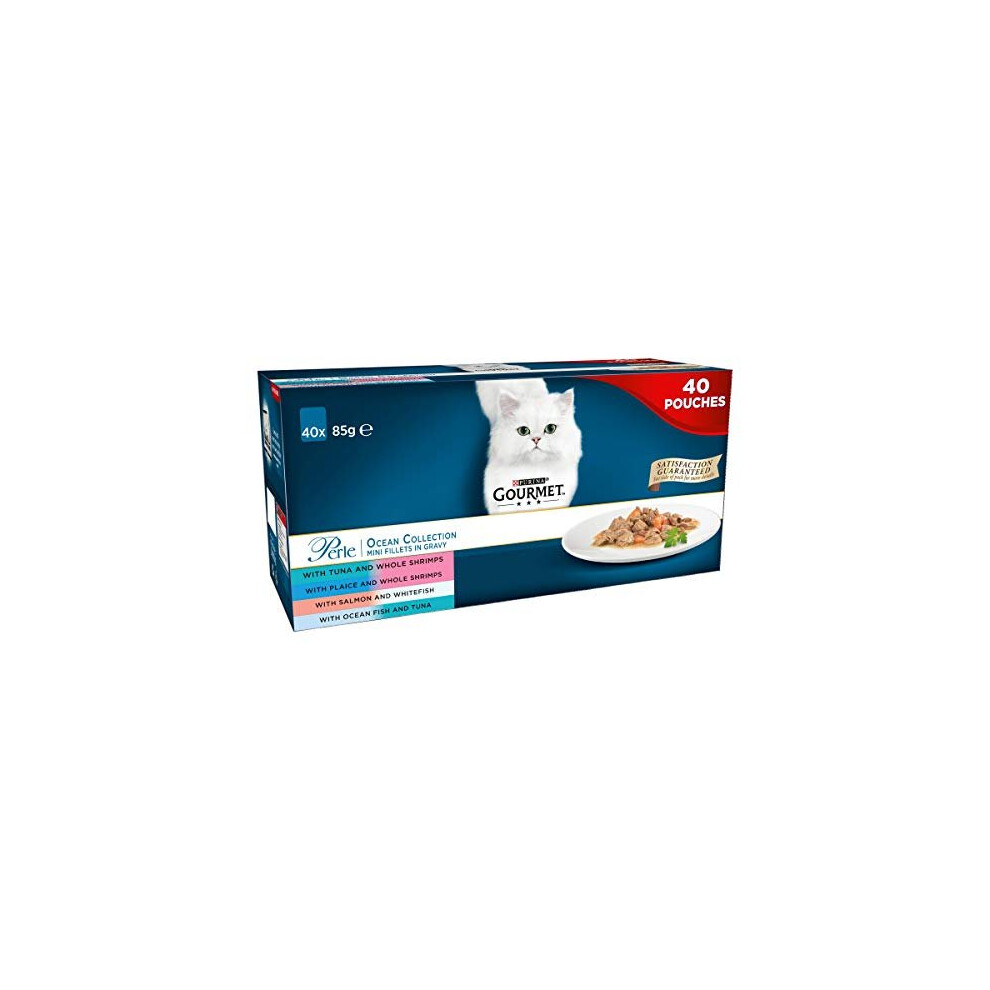 Gourmet Wet Cat Food Pouches in Gravy - Gourmet Perle Ocean Collection 40 x 85g - Mini Fillets - Mix of Whole Shrimps, Ocean Fish, Salmon and more,