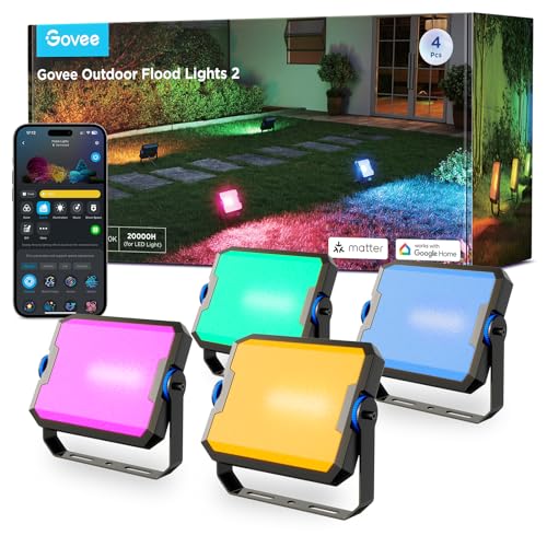 Govee Outdoor Flood Lights 2, RGBIC Floodlight Warm White with Alexa, Google Home, Matter, 50+ Scene Led Floodlight, Upgrated IP66 Waterproof Outdoor Led Lights for Garden, Courtyard, Landscap, 4 Pcs