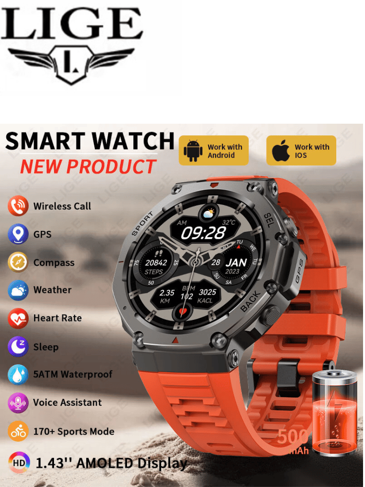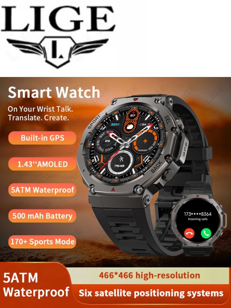 LIGE T-Rex 3 Ultra Smart Watch AMOLED Display 5ATM Waterproof Built-in GPS Dual-band GNSS Compass Military Rugged Smartwatch