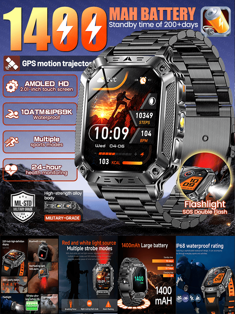 2026 New Built-in 1400mAh Super Large Battery Men Smart Watch Outdoor GPS 2.01"AMOLED Screen 10ATM Waterproof BT Call Smartwatch