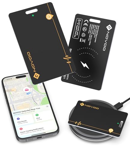 NOVOO Wallet Tracker Card 2-Pack, Rechargeable Wallet Finder (Wireless charging), Bluetooth Tracking Card 1.9mm Ultra-Slim, IP68 Waterproof (Only IOS, Apple Find My), Anti-loss GPS Air Tag for Luggage