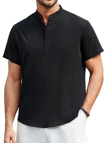Enlision Mens Black Linen Shirt Short Sleeve Collarless Grandad Shirts Casual Summer T-Shirts Lightweight Mandarin Collar Henley Top with 3 Buttons XL