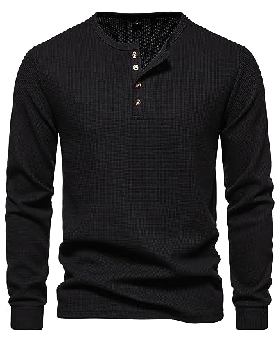 MakingDa Henley T Shirt Mens Long Sleeve Slim Fit Waffle Grandad Collar 4 Button Jumper Tops Smart Casual Collarless Shirts-Black-M