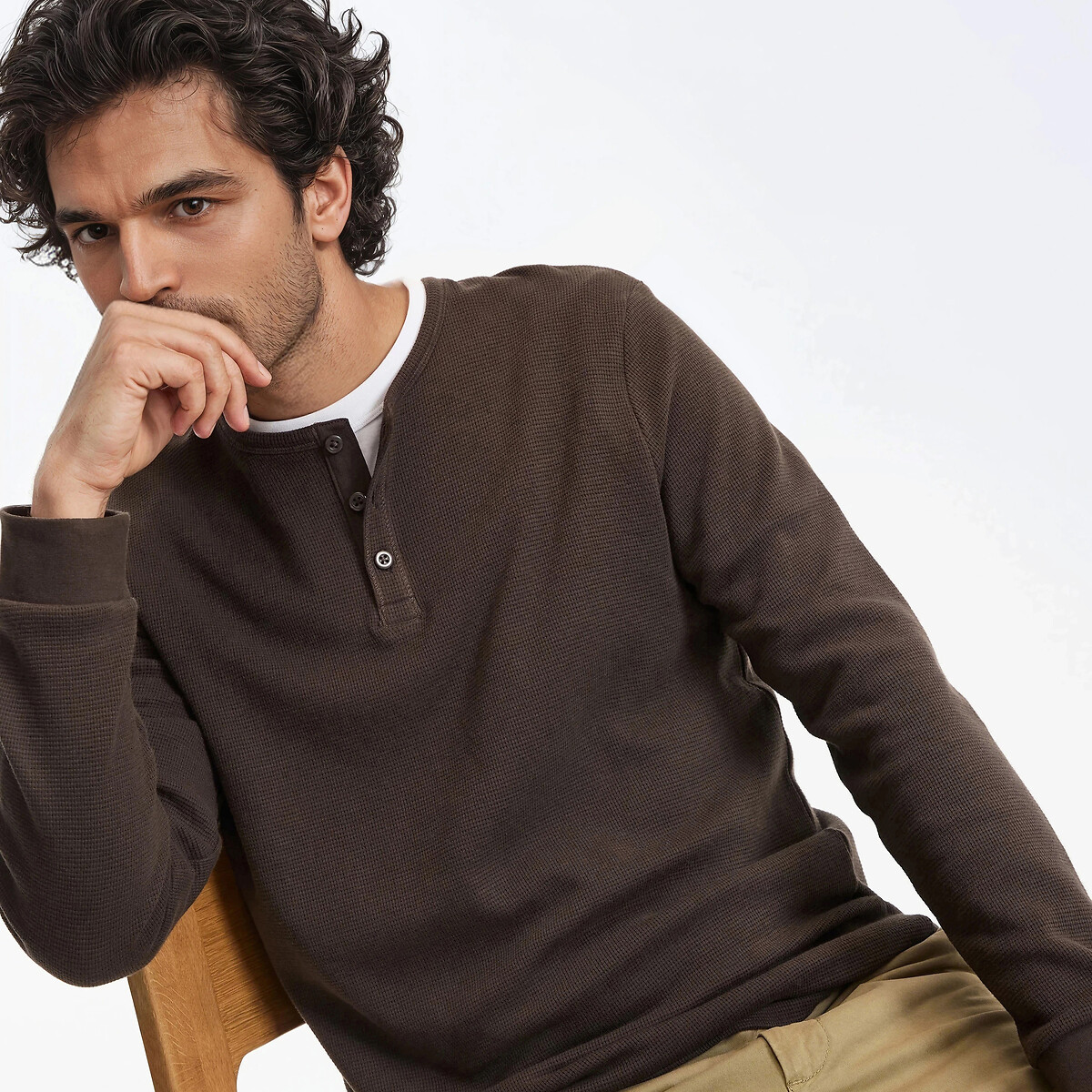 MakingDa Henley T Shirt Mens Long Sleeve Slim Fit Waffle Grandad Collar 4 Button Jumper Tops Smart Casual Collarless Shirts-Khaki-L