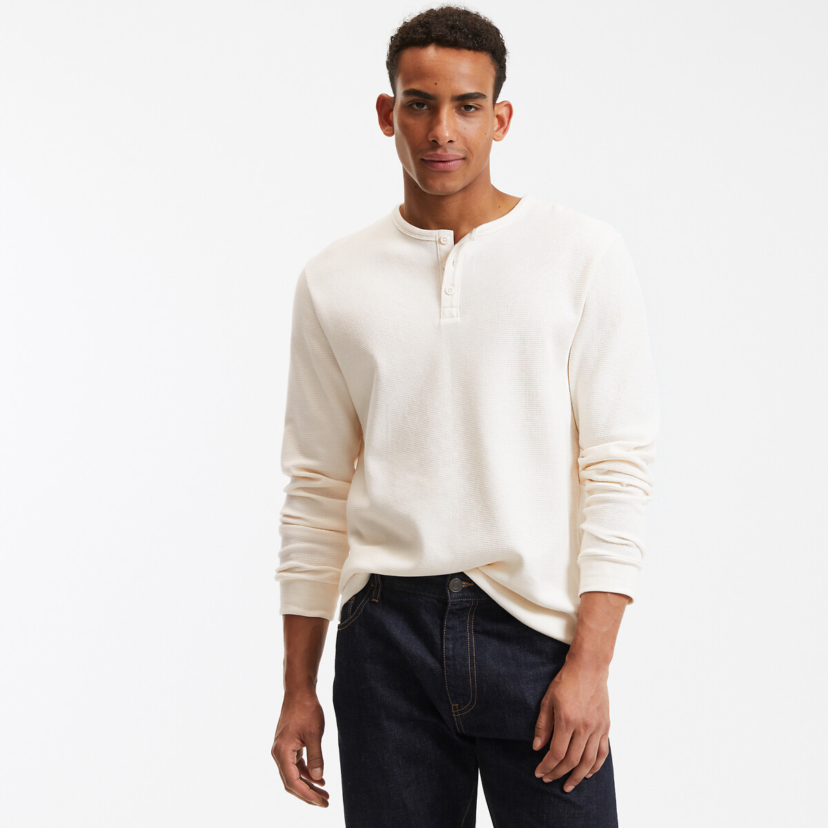 MakingDa Henley T Shirt Mens Long Sleeve Slim Fit Waffle Grandad Collar 4 Button Jumper Tops Smart Casual Collarless Shirts-White-L