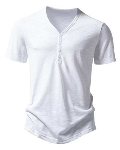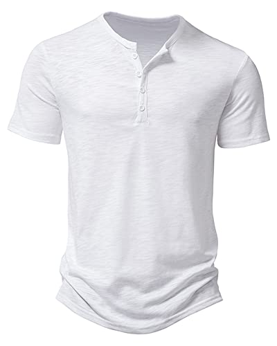 Men's Casual Grandad Collar Henley T Shirt Muscle Fit Summer Smart Short Sleeve 4 Buttons Tee Slim Fitted Collarless Polo T-Shirts Tops-White-M