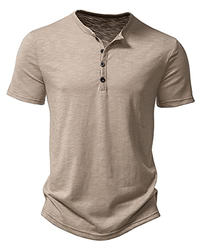 Men's Casual Grandad Collar Henley T Shirt Muscle Fit Summer Smart Short Sleeve 4 Buttons Tee Slim Fitted Collarless Polo T-Shirts Tops-Khaki-M