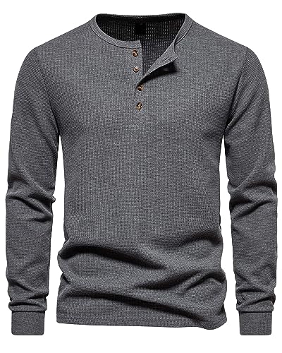 MakingDa Henley T Shirt Mens Long Sleeve Slim Fit Waffle Grandad Collar 4 Button Jumper Tops Smart Casual Collarless Shirts-Dark Grey-M
