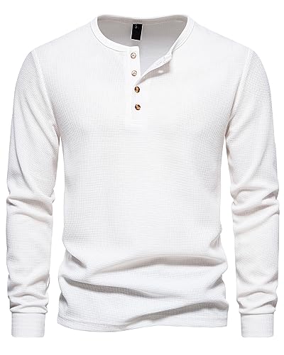 MakingDa Henley T Shirt Mens Long Sleeve Slim Fit Waffle Grandad Collar 4 Button Jumper Tops Smart Casual Collarless Shirts-White-XL