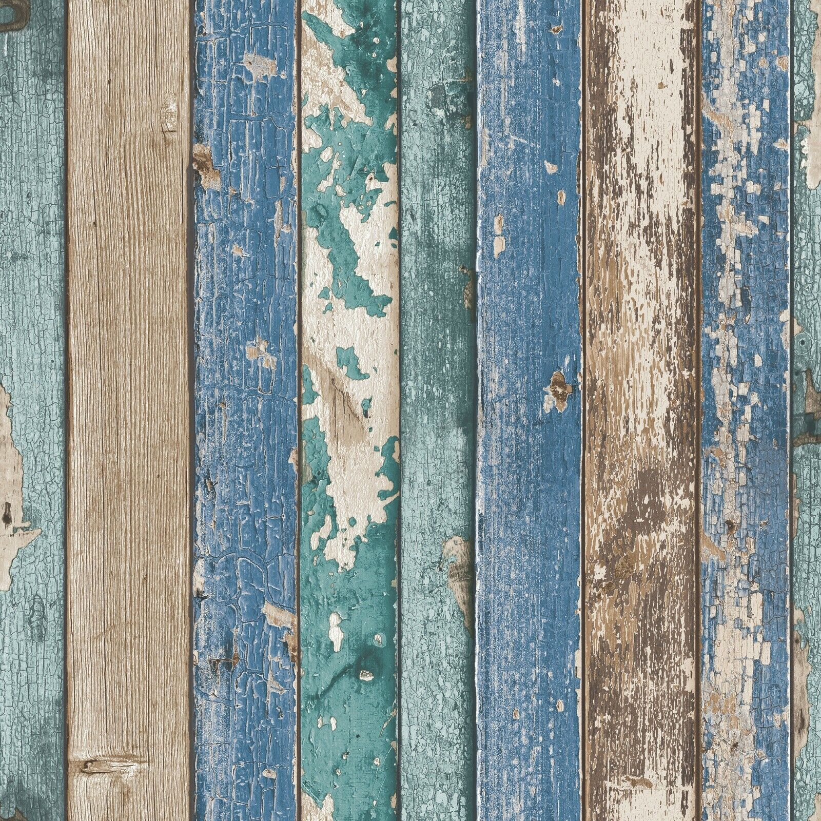 Rustic Distressed Elm Wood Plank Effect Blue Cabin Beige Realistic Wallpaper