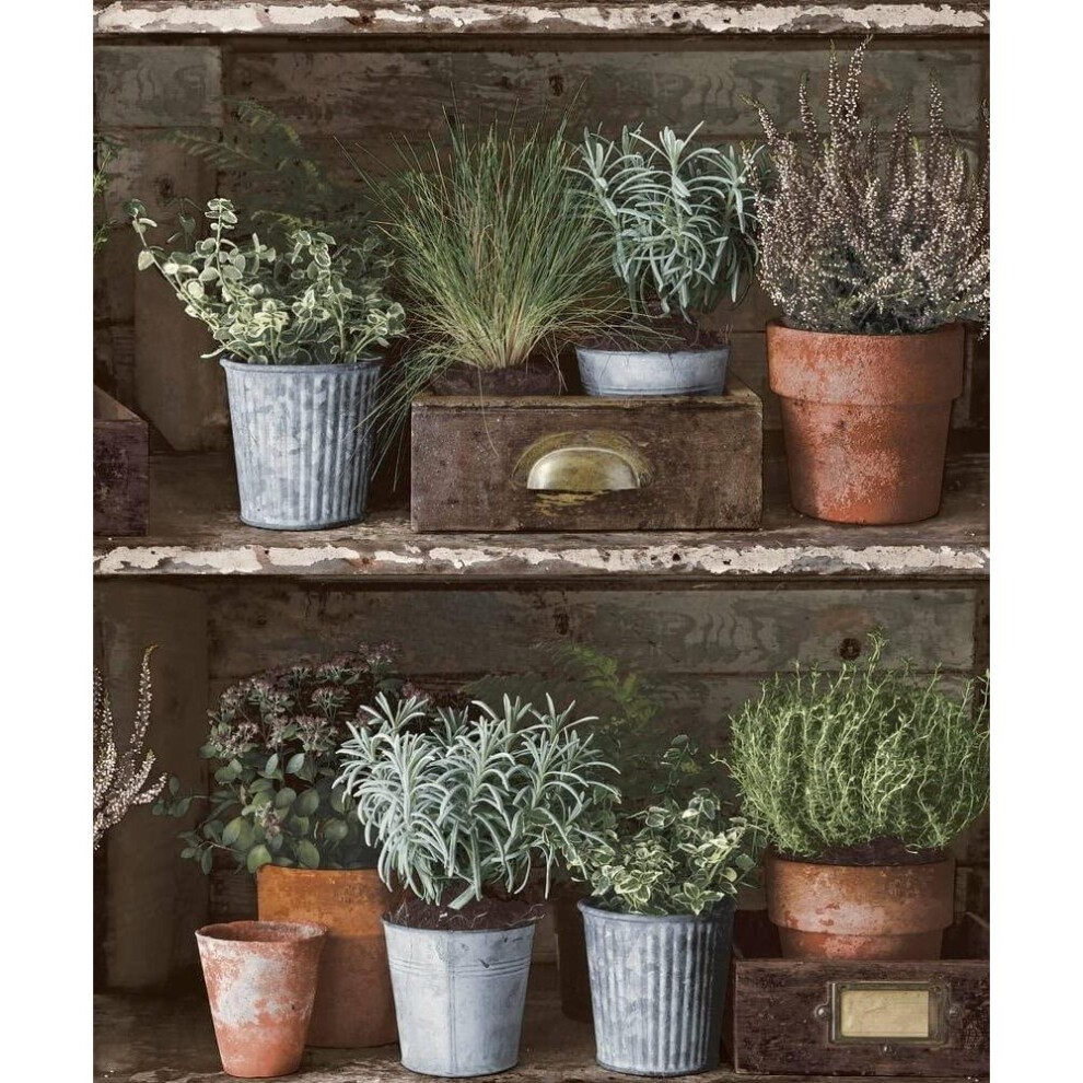 Grandeco Vinyl Wallpaper Flower Pots Paste The Wall Rustic Wood Effect