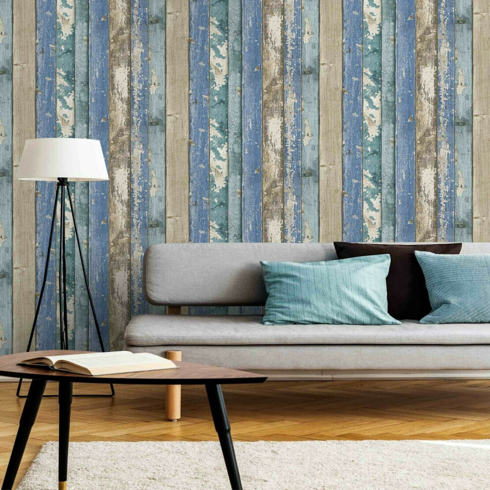 Rustic Distressed Elm Wood Plank Effect Blue Cabin Beige Wallpaper