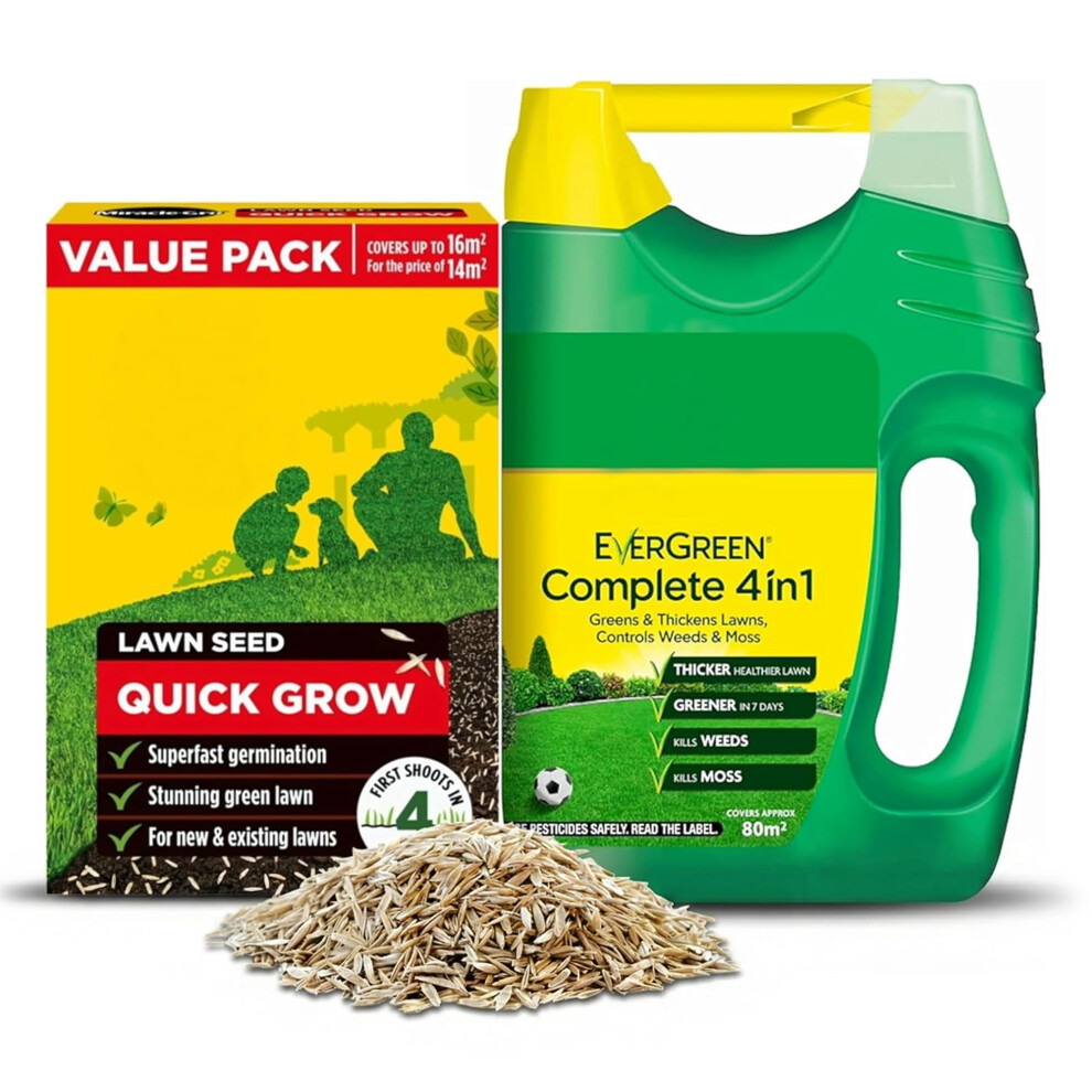 Fast Growing Grass Seed Bundle - Miracle Quick Grow Lawn Seeds 480g 16m2 & Complete 4in1 Lawn Food Spreader 2.8kg 80m2 Spring Lawns Feed Weed and Moss