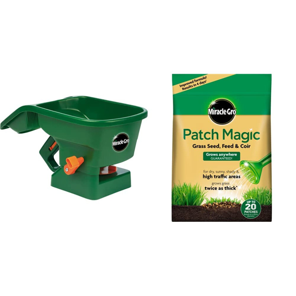 Miracle-Gro Rotary Lawn Seed Spreader & Patch Magic Grass Seed, Feed and Coir, 1015 g