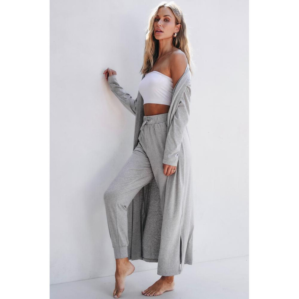 (Light Grey, S) Light Grey Split Long Cardigan and Skinny Pants Lounge Set