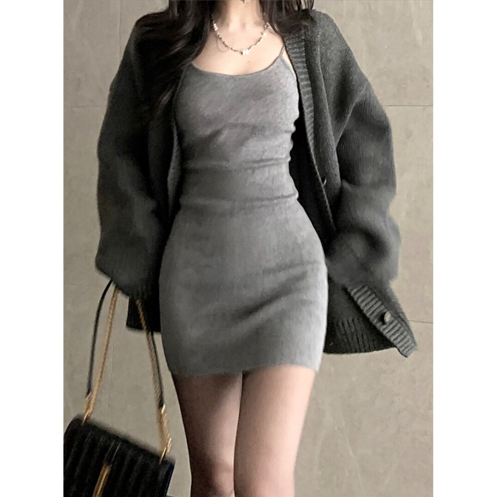 2 Piece Coat Dress Women Cardigan Gray Long Sweater Outerwear Pure Desire Versatile Knitted Hip Wrap Sling Mini Vestidos