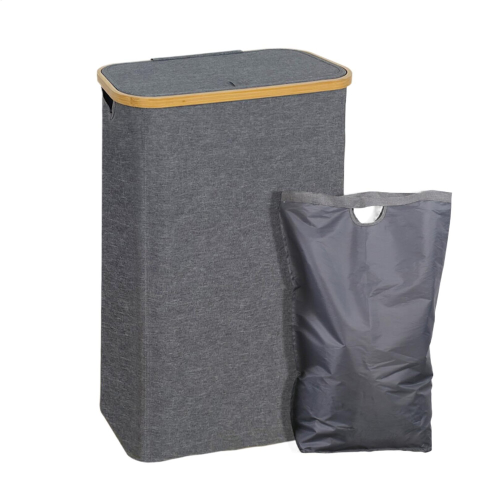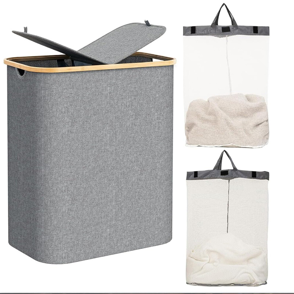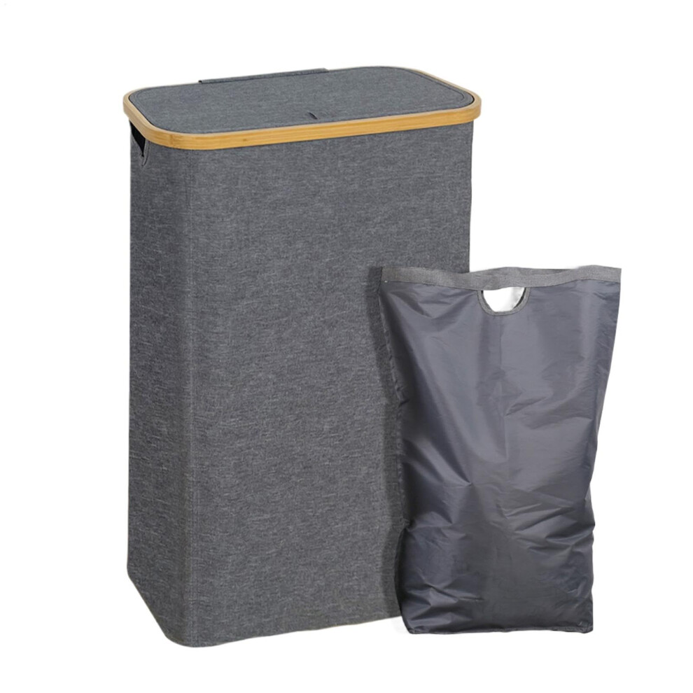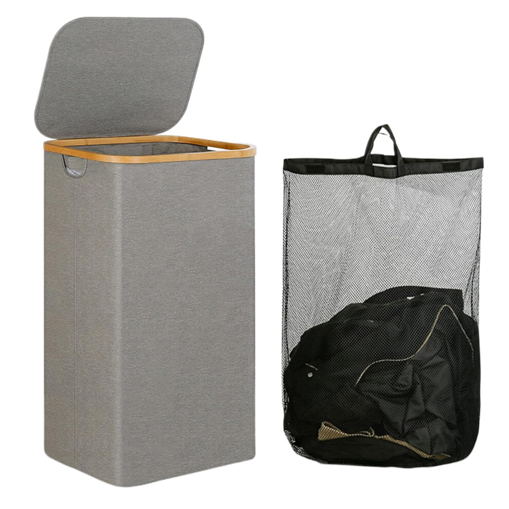 Laundry Basket with Lid, Foldable Bamboo Hamper, 2 Compartment Laundry Sorter with Removable Bags for Bathroom Bedroom Laundry Room Gray