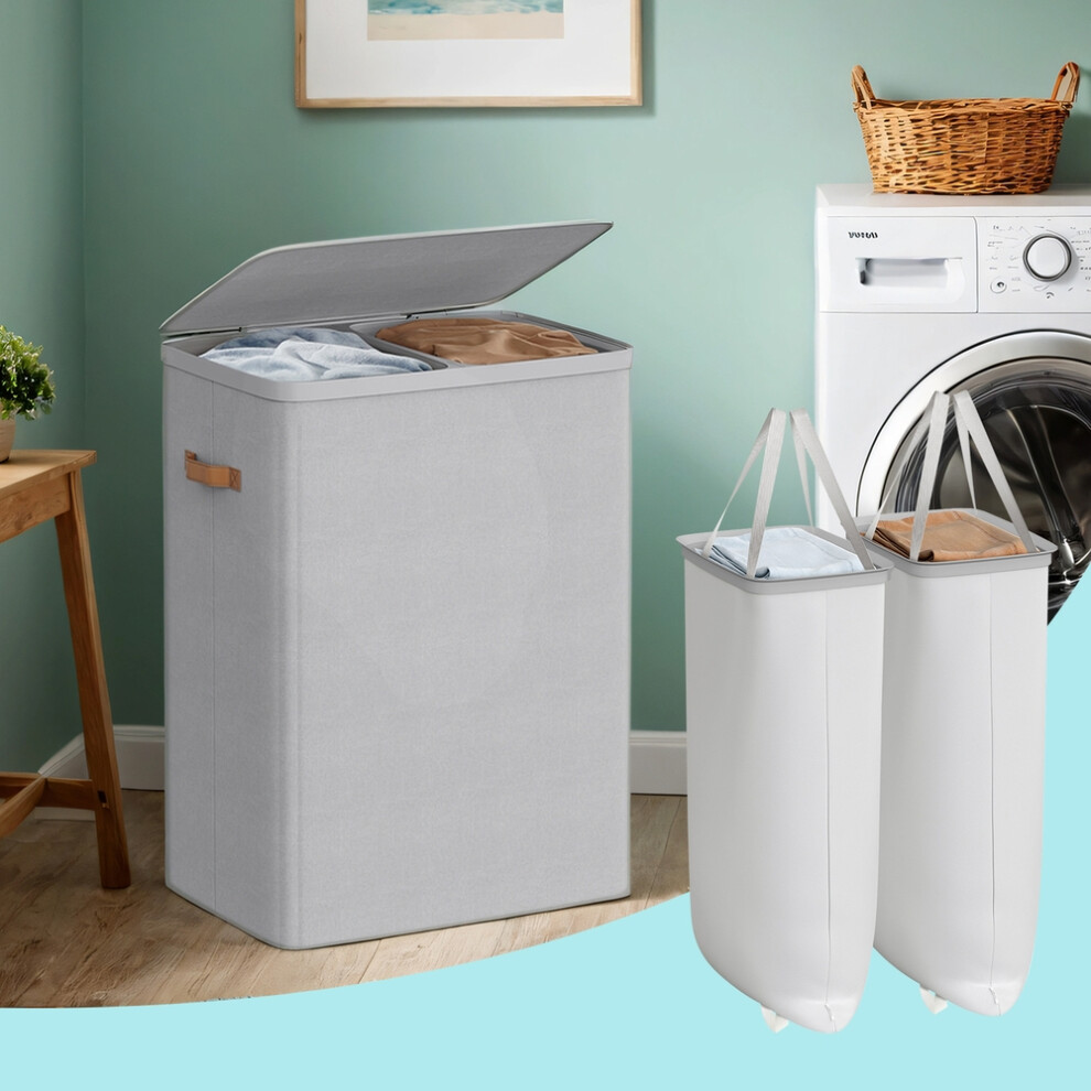 (Double Compartment Grey) Laundry Basket with Lid, Large Single and Double Compartment Laundry Hamper, Washing Baskets with Removable and Washable Inn