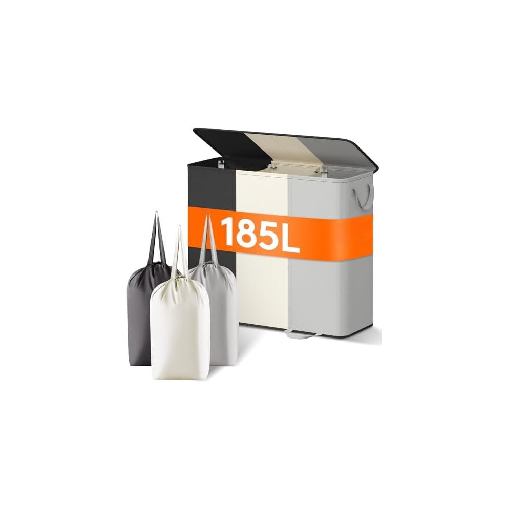 Triple Laundry Hamper with Lid & Removable Bags, 185L Collapsible 3-Section Basket, Handles, Black/White/Gray