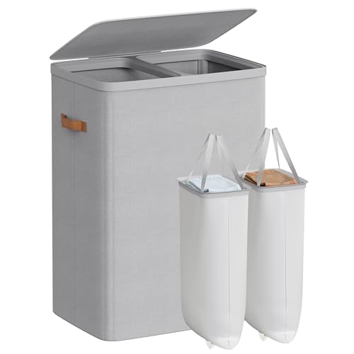 SONGMICS Laundry Basket, 170 L Dual Compartment Laundry Hamper, with Lid and Handles, Removable Liners, Easy Assembly, 56 x 40 x 75 cm, Dove Gray LCB813G01