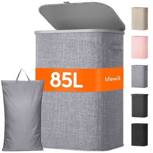 Lifewit 85L Laundry Basket with Lid, Large Laundry Hamper with Plastic Handles and Removable Bag, Foldable Tall Dirty Clothes Hampers for Laundry for Laundry Room, Bedroom, Bathroom, Dorm, Light Gray