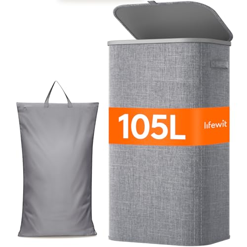 Lifewit 105L Laundry Basket with Lid, Large Laundry Hamper with Plastic Handles and Removable Bag, Foldable Tall Dirty Clothes Hampers for Laundry for Laundry Room,Bedroom,Bathroom,Dorm,Light Gray