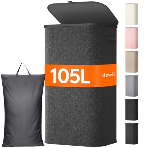 Lifewit 105L Laundry Basket with Lid, Washing Basket with Handles and Bag, Large Foldable Dirty Clothes Organiser with Plastic Frame for Laundry Room, Bedroom, Bathroom, Dark Gray