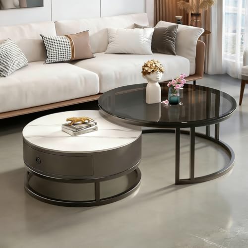 KAFHGEIN Modern Nesting coffee tables for living room with storage drawers, 2 PCS Small Round Coffee Table Set, With Rock board desktop(Gray,31.4x13in)